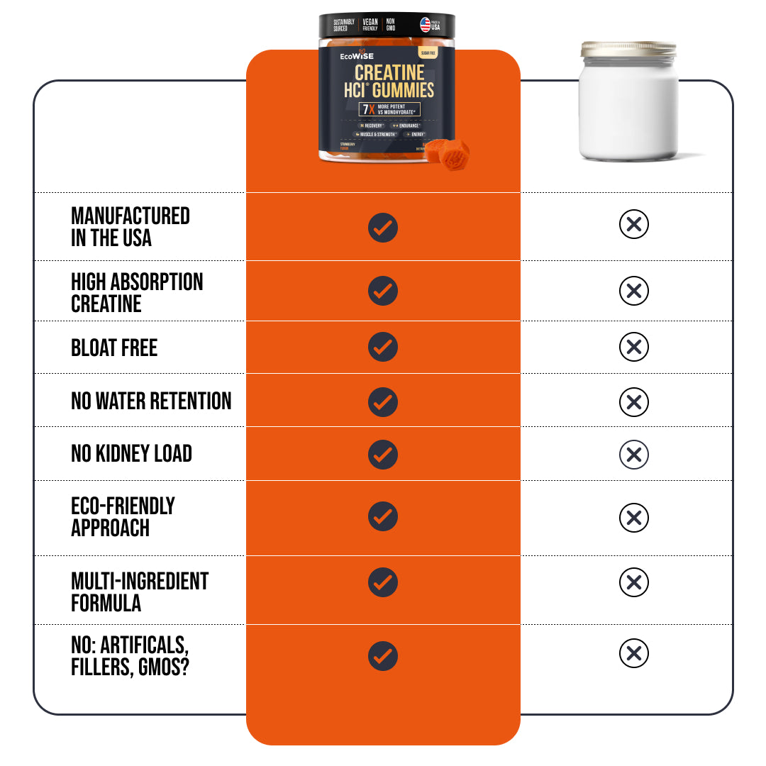 EcoWise Creatine HCL Gummies utilize creatine hydrochloride (HCL), known for its superior solubility and absorption. This means athletes can take lower doses while achieving the same or enhanced benefits as traditional creatine monohydrate, without the discomfort of bloating or digestive issues commonly associated with other forms of creatine.